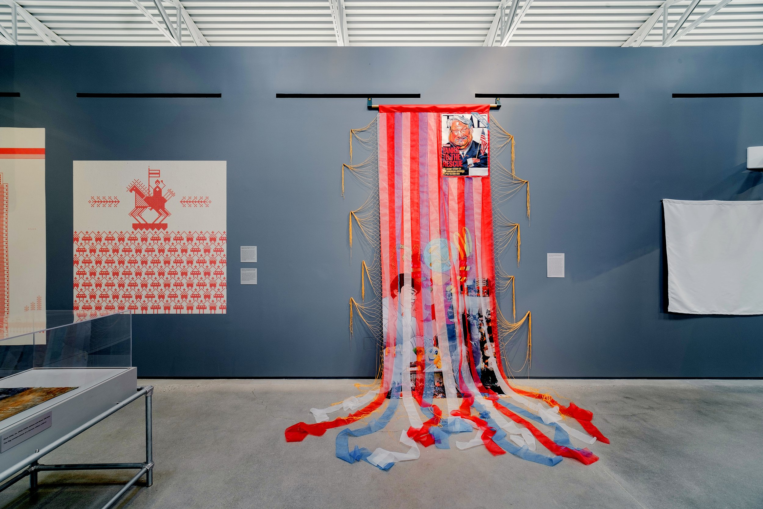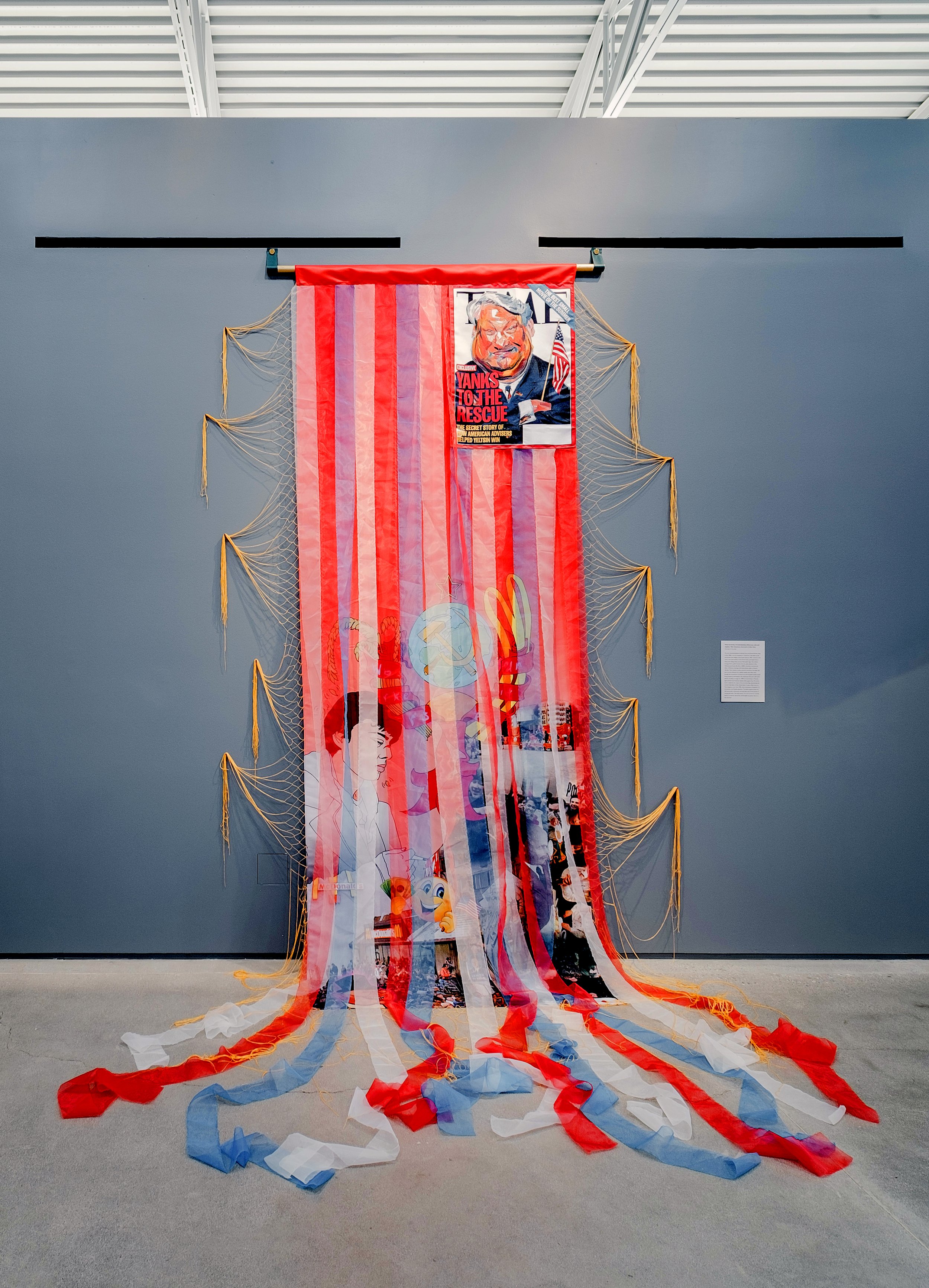 Digital print on duchess satin, poly organza, cotton thread, leather, wood, and nails