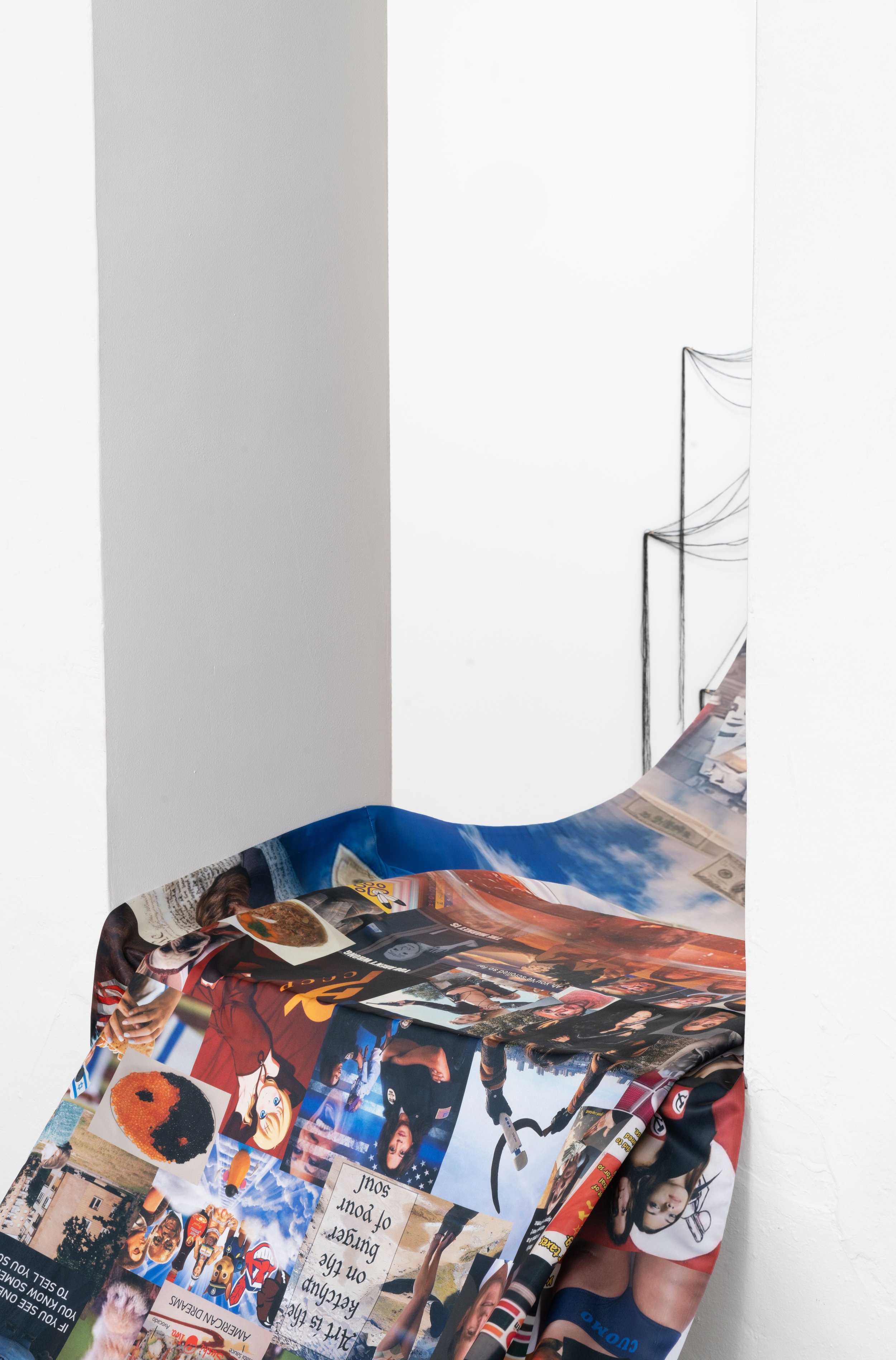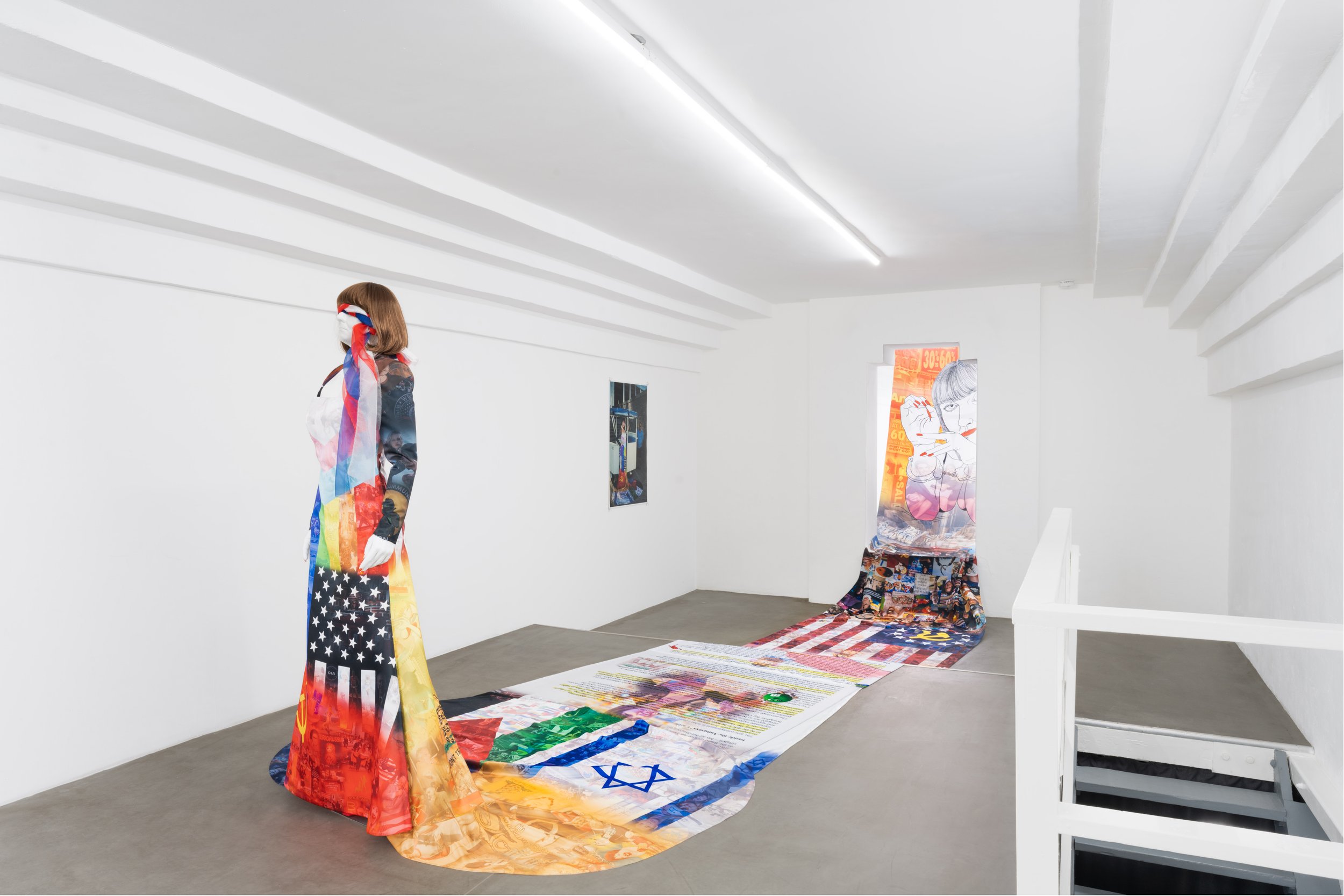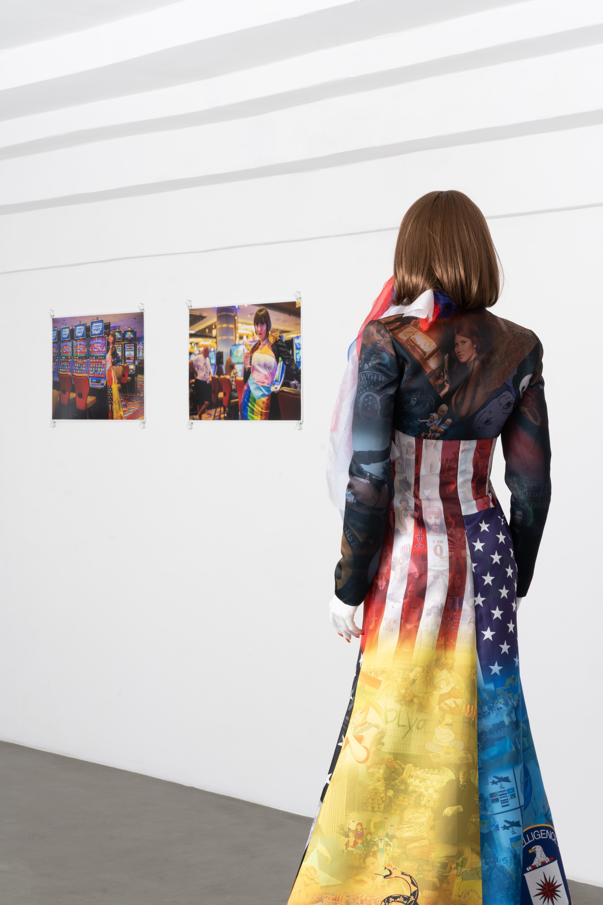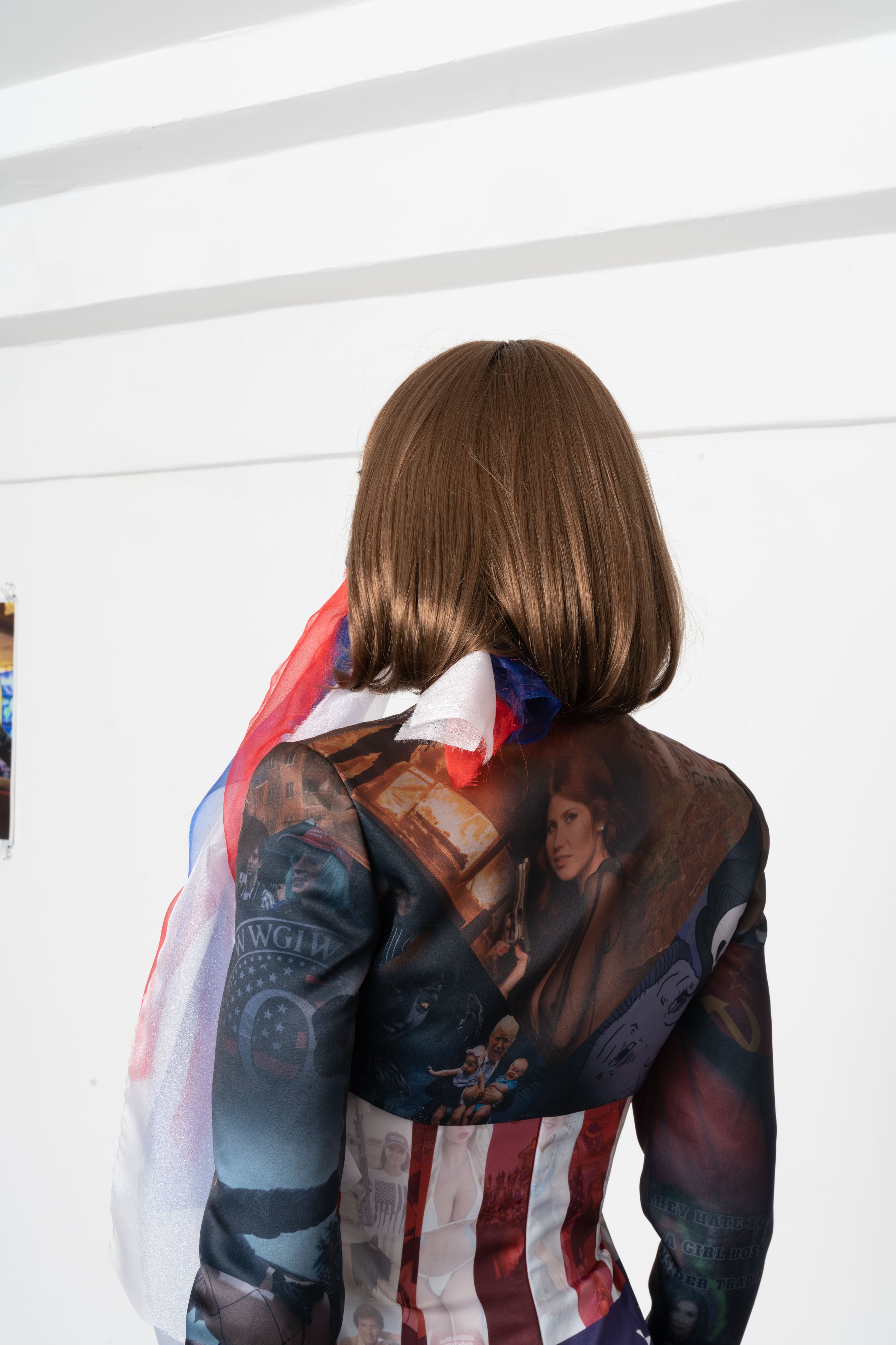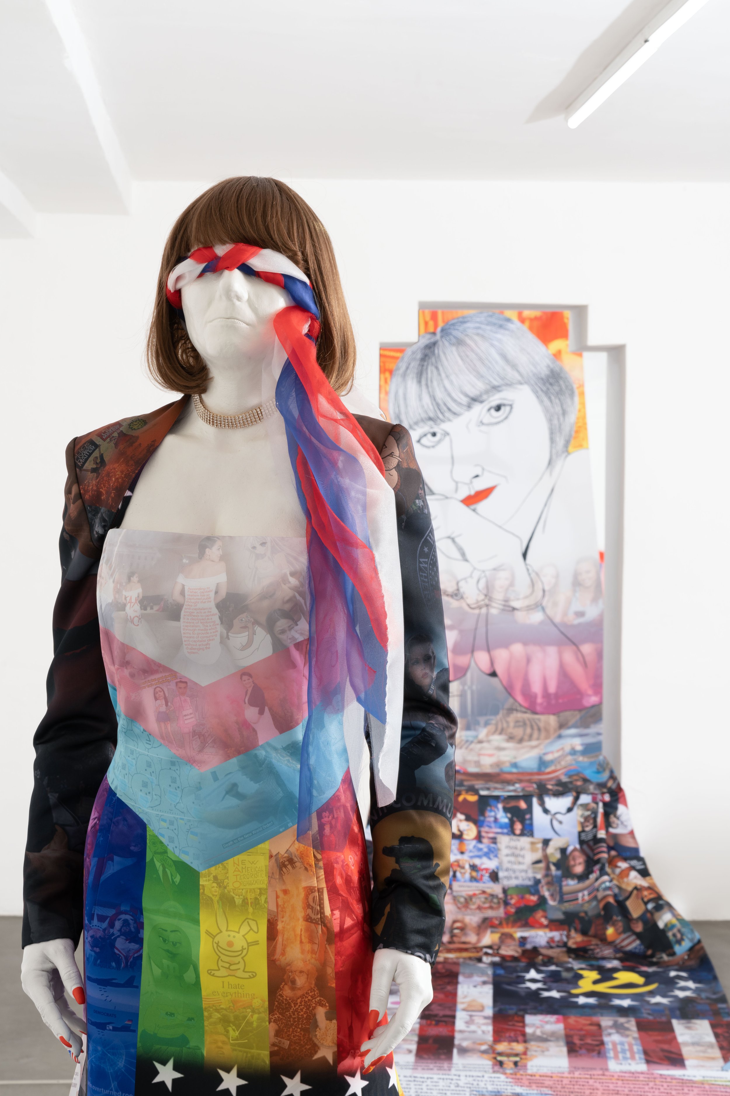 Slava Culture War!2022Dress: digital print on duchess satin, polyester, poly crystal organza, cotton thread, and sunflower petals from UkraineMannequin: fiberglass, plaster, wig, costume jewelry, and acrylic paint71h x 80w x 500d inches